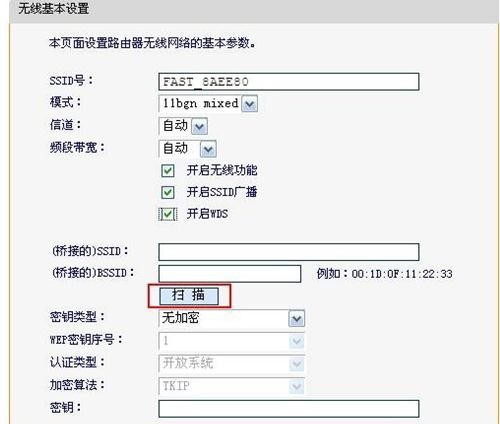 1、fwd105登陆管理界面,选择无线设置->基本设置”检查“开启WDS”->“扫描”,然后点击周围的无线信号搜索。